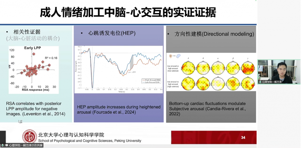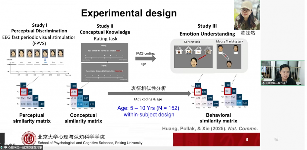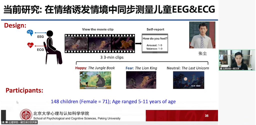 情绪是包含身体反应、主观体验、认知理解的复杂过程,而解博士研究团队的核心研究主线围绕人类情绪开展展开,即探索“人类的情绪从何开展而来”。这一宏大命题具体落实在三个相互关联的维度:其一,婴幼儿和儿童如何理解他人的情绪,即“向外看”;其二,儿童如何感受和体验自身的情绪,特别是内感受信号的作用,即“向内听”;其三,在前两者的基础上,进一步探究儿童情绪问题产生的根源。本次报告重点聚焦于前两个维度,分享了在情绪理解与情绪体验方面的最新进展。