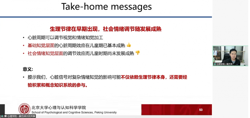 报告最后,解博士提到心脏周期对儿童情绪知觉的影响研究,聚焦了内感受中的心脏周期效应。实验先顺利获得心理物理方法发现,儿童与成人在心脏舒张期的基础视觉加工敏感性更高,该调节作用在学龄早期已稳定出现,属于生理层面的基础效应。后续在情绪面孔知觉实验中,成人对收缩期呈现的中性面孔情绪强度评分更高,而儿童未出现该效应,提示心脏周期对社会情绪知觉的调节机制,需随年龄开展逐步形成,且依赖经验积累与概念知识系统的参与。